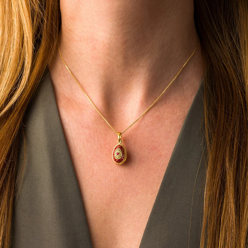 These pendants are embellished with fine filigree and enamel in Faberge style. Also, the pendant is decorated with Meander design.